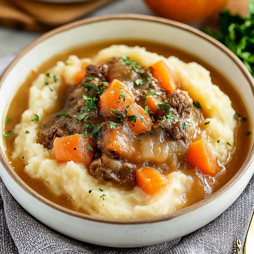 7. Serve mashed potatoes topped with the apple cider beef stew.