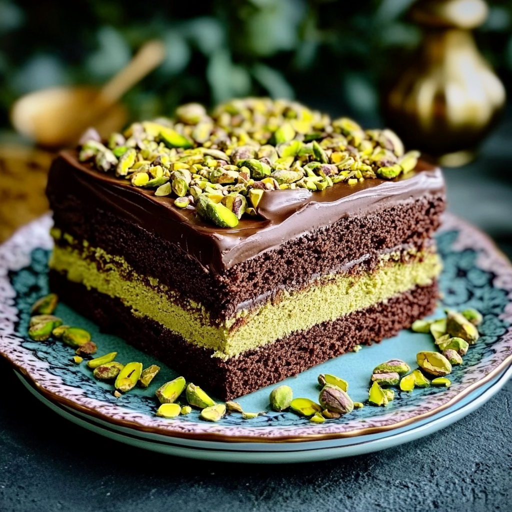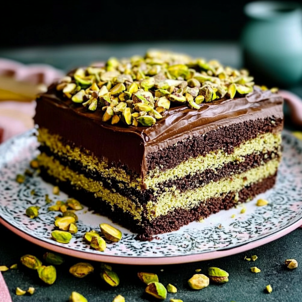 • Serve a generous slice of the cake on its own to appreciate the layers of chocolate and pistachio flavors.